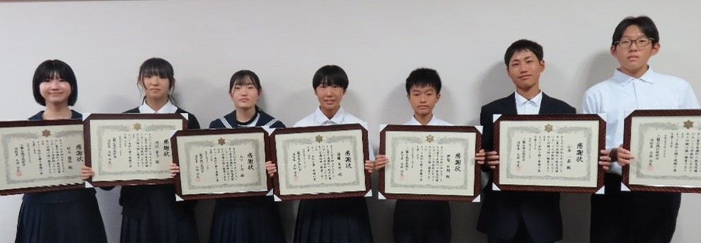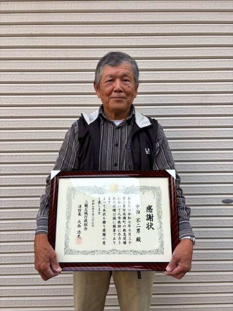 消防協力者に感謝状を贈呈 2025.10.31 10月27日、高瀬中学校の生徒の皆さんと中西不二男さんに感謝状を贈呈しました。令和7年7月30日、三豊市高瀬町の住宅庭先に倒れていた方を発見し、協力しながら救急要請をしていただきました。高瀬中学校の生徒の皆さん ※左から村上 陽依さん・河田 芽弓さん・山下 小乃さん・須藤 美空さん・伊関 日翔さん・山本 一嘉さん・光井 橙弥さん中西不二男さん