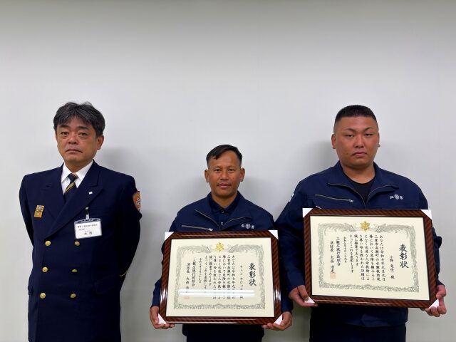 消防協力者に表彰状を贈呈 2025.10.31 10月29日、片岡 頼人さん、小野 竜佳さん、チェン サロッチさんに表彰状を贈呈しました。片岡 頼人さん、小野 竜佳さん、チェン サロッチさんは、令和7年9月9日、三豊市高瀬町で発生した水難救助事案において、危険を顧みることなく、池に転落した軽トラックから逃げ遅れた方を救出され、尊い命を救っていただきました。左から大西消防長・チェン サロッチさん・小野竜佳さん※片岡さんは都合により欠席