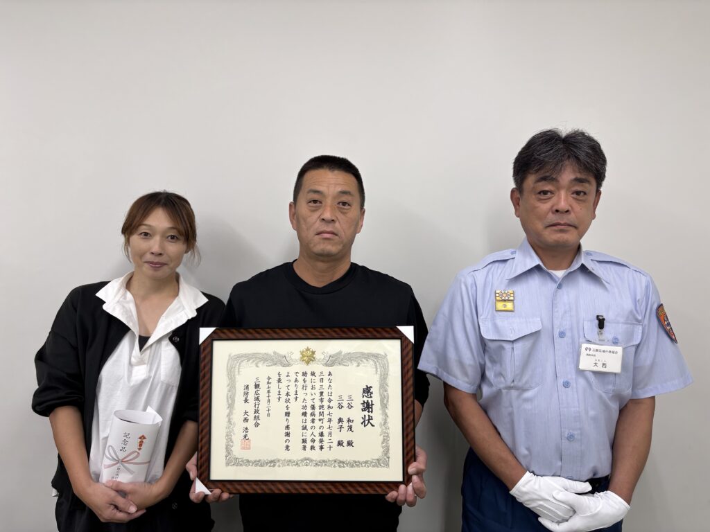 消防協力者に感謝状を贈呈 2025.10.21 10月20日、詫間町にお住まいの三谷和茂さんと三谷典子さんに感謝状を贈呈しました。三谷和茂さんと三谷典子さんは、7月23日、管内で発生した爆発事故において、負傷された方を救護しながら119番通報を行い、救急隊との中継地点まで搬送、人命救助に尽力していただきました。